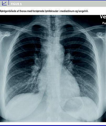Den endelige diagnose blev stillet ved biopsi af de patologisk forstørrede lymfeknuder i mediastinum og lungehilii, der var påvist ved røntgen og computertomografi af thorax (Figur 1 ).