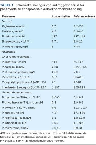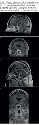 En 64-årig mand, der havde biopsiverificeret sarkoidose med moderate lungeforandringer samt ledaffektion og var velbehandlet på methotrexat gennem fire år, blev indlagt i en akutmodtagelse til udredning for træthed. Trætheden var progredieret over tre uger, og han beskrev det selv som udtalt fysisk og psykisk træthed. Han havde intermitterende frontalhovedpine, svimmelhed, sløret syn og påvirket kognition. Den objektive undersøgelse viste normale forhold uden neurologiske udfaldssymptomer, og initiale biokemiske undersøgelser forud for påbegyndelse af behandling viste let påvirkede inflammationsmarkører og stigende plasmaværdier af interleukin-2-receptor (IL-2R) og peptidyldipeptidase A (angiotensinkonverterende enzym, ACE) sammenholdt med tidligere målinger. Hypofyseprøver viste flg. værdier lavt P-thyrotropin med lav P-thyroxin og et spotkortisolniveau på < 14 nmol/l (referenceværdi: 171-536 nmol/l) og P-kortikotropin (adrenokortikotropt hormon, ACTH) 8 ng/l (referenceværdi: 7-64 ng/l) samt affektion af gonadeaksen (Tabel 1). CT af cerebrum viste ingen akutte forandringer, men diffus slimhindefortykkelse i bihulerne. Den modtagende læge konfererede med vagthavende reumatolog, og mistanken om neurosarkoidose blev bestyrket. Lumbalpunktur viste tegn på inflammation i cerebrospinalvæsken med et leukocytniveau på 20 x 106/l af mononukleær type, men normal koncentration af protein og glukose. I de supplerende undersøgelser af rygmarvsvæsken påvistes ingen infektion og malignitet. En MR-skanning af cerebrum inklusive hypofysen viste en kontrastopladende timeglasformet tumor, der målte 13 x 13 x 21 mm og involverede hypothalamus og hypofysen. Af radiologen blev den beskrevet som værende forenelig med hypotalamisk-hypofysær sarkoidose (Figur 1A + B). Der blev indledt behandling med methylprednisolon 500 mg x 1 dagl. i tre dage for neurosarkoidosen og for den akutte binyrebarkinsufficens. Få dage efter angav patienten at være i nærhabituel tilstand. En kontrolskanning efter to måneder viste total regression af tumorprocessen (Figur 1C). I efterforløbet blev der indledt substitutionsbehandling med hydrokortison og stofskiftehormon. To måneder efter symptomdebut udviklede patienten diabetes insipidus, hvorfor der blev iværksat vasopressinbehandling.