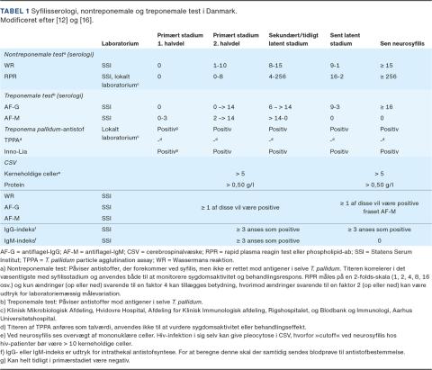 Til diagnostik af syfilis, herunder NS, indgår både nontreponemaltest (NTT) og treponemaltest (TT) (Tabel 1). Sandsynligheden for at finde pleocytose eller positiv TT eller NTT i cerebrospinalvæsken (CSV) efter behandling af ukompliceret syfilis er lav [4]. Der findes ingen definitive kriterier for diagnosen NS, den stilles på baggrund af kombinationen af kliniske symptomer og CSV-fund (Tabel 1) [12, 13]. Generelt udelukker en negativ TT i serum, at patientens symptomer kan skyldes NS (Figur 1). Ligeledes vil en negativ NTT i serum (f.eks. rapid reagin plasma titer (RPR)) oftest udelukke en NS, men NNT kan være negativ enten meget tidligt eller sent i infektionen (Figur 1 og Tabel 1) Der ses højere celletal ved tidlig NS end ved sen NS, og CSV kan være normal ved tabes dorsalis ligesom ved gummatøs syfilis i hjernen [4] samt ved okulær og otologisk syfilis [14, 15]. I Danmark anvendes til CSV-analyse Wassermanns reaktion (WR), antiflagel-IgM og -IgG (AF-M og AF-G) samt beregning af IgM- og IgG-indeks (intratekalsyntese) [16] (Tabel 1).