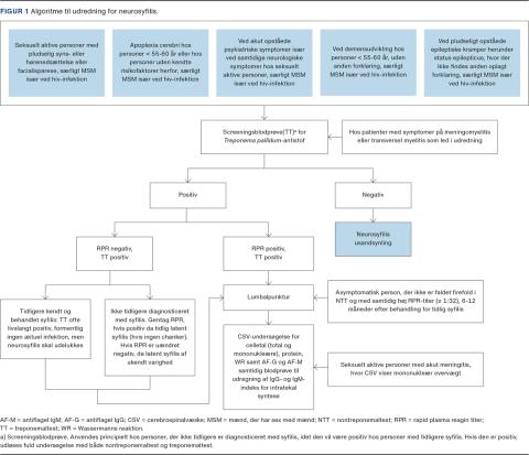 I det danske studie af personer, som har syfilis og hiv-koinfektion, fik hovedparten af de patienter, der fik NS, diagnosticeret tilstanden i de tidlige stadier af syfilis, heraf flertallet i sekundærstadiet [11]. De infektionsmedicinske afdelinger i Danmark tilbyder årlig screening for syfilis af de patienter, som er hiv-inficerede, og MSM kan selvhenvende sig med henblik på syfilishurtigtest hos f.eks. Checkpoint (AIDS-Fondet) samt til undersøgelse for syfilis på klinikker for kønssygdomme eller hos egen læge. En stor del af MSM med syfilis vil derfor med høj sandsynlighed blive diagnosticeret med syfilis. Personer, der ikke har andre symptomer på syfilis end neuropsykiatriske, otologiske og oftalmologiske, vil imidlertid ses på psykiatriske, neurologiske, otologiske og oftalmologiske afdelinger, hvor erfaringen med infektionen formentlig er mindre. Det er derfor essentielt at spørge ind til risikofaktorer, såsom seksuel orientering, rejseaktivitet og tidligere udstationering i højendemiske områder for syfilis. Man kan frygte, at selvoplyst heteroseksualitet vil være en »risikofaktor« for forsinkelse af diagnosen NS, jf. den lave forekomst og manglende erfaring med tilstanden. I studiet af Danielsen et al [9] fandt man, at kun én ud af de 44 patienter med NS, der blev set i neurologisk eller psykiatrisk regi, var mistænkt for at have NS, inden svaret på rutineserologisk screening forelå. I opgørelsesperioden 1980-1997 var screening med WR rutine i de fleste neurologiske og psykiatriske afdelinger [9]. Pga. den sjældne forekomst af NS i Danmark foreslår vi en udredningsalgoritme som vist i Figur 1, så der ikke ensidigt fokuseres på tilstande som borreliose, dissemineret sklerose og herpes zoster som årsag til især neurologiske eller oftalmologiske tilstande som nævnt i ovenstående. Herudover tilrådes øget opmærksomhed på at undersøge for syfilis hos psykiatriske patienter, der samtidig udviser neurologiske symptomer, samt hos yngre personer med demens og apopleksi.