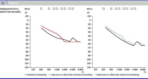 På den audiologiske afdeling fandt man inden påbegyndelse af antibiotisk behandling en middelsvær sensorineural hørenedsættelse med let asymmetri. Hørenedsættelsen var værst i mellem- og diskanttonerne og lå i det område af frekvenser, som er af stor betydning for hørelsen. Audiometri en måned efter afsluttet antibiotisk behandling viste en lille forbedring i hørelsen i bas- og mellemtoner, mens hørenedsættelsen i diskanttonerne forblev uændret (Figur 1 ). Patienten blev behandlet med høreapparater bilateralt. Man valgte en type med mulighed for tilslutning af maskeringsfunktion mod tinnitus. Det blev dog ikke aktuelt, da høreapparaterne i sig selv gav en lindring af tinnitus.