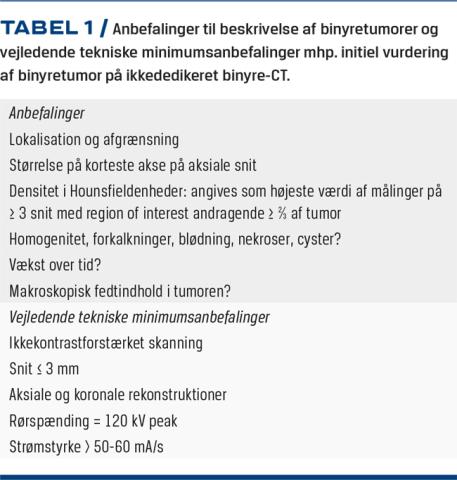 Høj snittykkelse (> 3 mm), lav strømstyrke (< 50-60 mA/s) samt høj rørspænding (> 120 kV peak (kVp)) øger risikoen for falsk lave HU-værdier. Effekten af lavere rørspænding (< 120 kVp) er uforudsigelig og kan lede til såvel falsk positive som negative [19]. Ved korrekt måling af HU skal region of interest andrage ca. to tredjedele af tumoren og undgå kant, nekroser, blødning, cyster og kalcifikationer. Tekniske krav til bedømmelse af binyretumorer på CT foretaget på anden indikation er angivet i Tabel 1.
