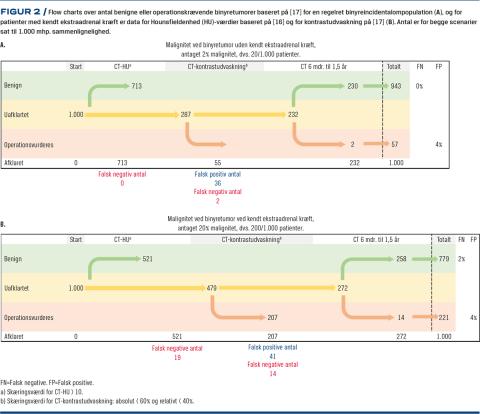 I den følgende gennemgang kan det være en fordel at følge Figur 2 og se det falsk positive og falsk negative antal i hhv. en regelret BI-population (Figur 2A) og i en population med ekstraadrenal kræft (Figur 2B).