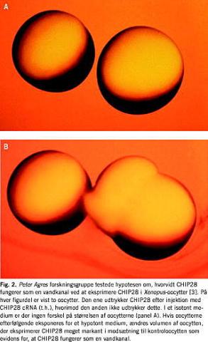 Peter Agre gjorde sin epokegørende opdagelse af aquaporinvandkanaler gennem en række studier i perioden 1989-1992. Peter Agres forskningsgruppe arbejdede på det tidspunkt med rhesusantigenet. I forbindelse med dette arbejde fandt gruppen et »kontaminerende« bånd i elektroforesegelerne af membranproteiner oprenset fra erytrocytter (et bånd på ca. 28 kDalton). Først oprensede Peter Agre og hans kolleger dette protein fra erytrocytter og karakteriserede dette biokemisk [1]. Dernæst sekventerede og klonede de genet og bestemte aminosyresekvensen for proteinet [2]. Resultaterne af initiale analyser indikerede, at proteinet havde seks membranspændende domæner og havde homologi med en gruppe proteiner, som tentativt kunne forme kanaler i membraner. På baggrund af disse studier benævntes proteinet CHIP28 for channel-like integral membrane protein of28 kDa. For at afdække funktionen af dette protein foretog Peter Agre i tredje trin sammen med sine kolleger ekspressionskloning af CHIP28 i Xenopus -oocytter og kunne derved vise, at CHIP28 var en vandkanal (Fig. 2 A og B) [3]. Gennem det fjerde og sidste trin oprensede Peter Agre og kolleger CHIP28 fra erytrocytter og rekonstituerede det i artificielle lipidmembraner (proteoliposomer), hvilket førte til mere detaljerede biofysiske studier, som viste, at CHIP28-proteinet i sig selv er en vandselektiv kanal, og at dette protein ikke transporterer protoner eller andre små molekyler [4]. Disse fund er senere blevet bekræftet af andre. Vandkanaler fik herefter hurtigt navnet aquaporiner, »vandporer«.