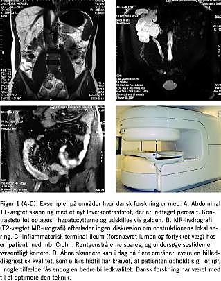 Til leverskanning findes ikke bare de traditionelle uspecifikke kontraststoffer, men også leverspecifikke stoffer. Nogle akkumuleres i hepatocytterne for siden at blive udskilt med galden, mens andre ophobes i det retikuloendoteliale system. De kan enten øge eller sænke signalintensiteten. En ny generation, som drikkes, er på vej (Figur 1 A). Hos patienter med symptomer på lidelser i galdevejene er MR-kolangiopankreatikografi (MRCP) blevet den primære undersøgelsesteknik i stedet for den invasive diagnostiske endoskopiske retrograde kolangiopankreatikografi (ERCP). Samme teknik anvendes nu til undersøgelse af urinvejene (Figur 1B). Både for lever og nyrer er det muligt at kombinere morfologiske undersøgelser med funktionelle. MR-skanning af tarmen (Figur 1C) i forbindelse med inflammatorisk tarmsygdom er et reelt alternativ til den klassiske undersøgelse af tyndtarmspassagen, hvor man anvender røntgenstråler. De genitale organer samt blæren og rectum undersøges ofte med fordel med MR-skanning. Diagnostik af lymfeknudemetastaser har hidtil været baseret på størrelsen, og man har således overset mange metastaser. Nye kontraststoffer, der kun ophobes i normalt lymfevæv, men ikke i metastatisk væv, synes at vende rundt på dette forhold. MR-skanning af mammae til påvisning af multifokalitet før operation eller recidivpåvisning vinder hastigt indpas. MR-skanning konkurrerer med CT om at være bedst til at fremstille karsystemet visuelt; MR har stort set erstattet den diagnostiske angiografi. Behandlingskontrol af kræft med f.eks. helkropsskanning er en hastigt stigende del af dagligdagen, mens MR-simuleret stråleterapi (på grund af den gode bløddelsopløselighed) endnu er forskning. Af samme grund kan kontrol af nogle kræftpatienter med fordel overgå fra den traditionelle CT til MR-skanning.