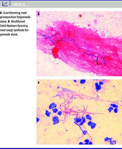Direkte mikroskopi af materialet viste grampostive forgrenede stave (Figur 1 A), der var svagt syrefaste ved modificeret Ziehl-Neelsen-farvning ( Figur 1 B). Nocardia blev mistænkt som årsag til patientens cerebrale absces, og behandlingen ændret til intravenøs sulfamethoxazol-trimethoprim.