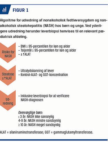NAFLD/NASH er hos børn og voksne oftest asymptomatisk og kan være et tilfældigt fund [2] af leversteatose ved ultralydskanning og forhøjet levertal [4]. Ultralydskanning har lav sensitivitet, og steatose detekteres først ved > 20% fedt i leveren; der er desuden interobservatørvariation, og graden af fibrose er vanskelig at afgøre [4]. De hyppigste kliniske symptomer er uspecifikke i form af almen sygdomsfølelse, træthed, svimmelhed, ubehag eller smerter i øvre abdomen. European Society for Pediatric Gastroenterology, Hepatology and Nutrition anbefaler, at man screener overvægtige børn med måling af levertal og ultralydskanning, især børn med familiær forekomst af NAFLD, abdominal fedme eller insulinresistens [8]. I Figur 1 angives en algoritme for udredning af overvægtige børn, hos hvem man har mistanke om NAFLD. Risikoen for avanceret leversygdom stiger med alderen [9]. Udredningsstrategien hos små og mindre børn er anderledes end hos større børn, idet genetisk og/eller metabolisk sygdom er mere sandsynlig hos dem. Den viste algoritme er primært relevant for større børn. Man bør i første omgang kontrollere alaninaminotransferase (ALAT)-niveauet og foretage ultralydskanning af leveren med henblik på undersøgelse for leversteatose. Den endelige diagnose stilles ved leverbiopsi, hvor andre behandlingskrævende leversygdomme, som autoimmun hepatitis og mb. Wilson kan afkræftes.