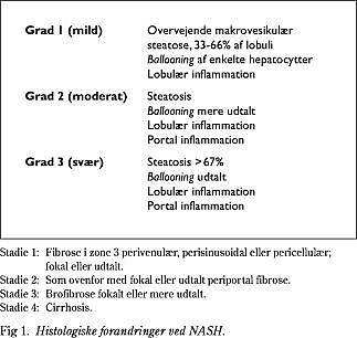 NASH kan føre til fibrosis hepatitis og cirrhosis hepatitis med udvikling af kronisk leversvigt og behov for levertransplantation samt øget risiko for udvikling af primær leverkræft. Oversigtsartiklen redegør for de kendte epidemiologiske karakteristika, en patogenese der omfatter to trin med lipidophobning (steatose, NAFLD) og senere udvikling af steatohepatitis (NASH). Et forslag til udredningsprogram, indikation for leverbiopsi og opfølgningsregimen gives.
