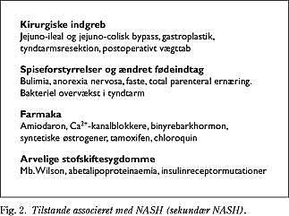 Det har været kendt i mange år, at en række tilstande kan føre til NASH (Fig. 2 ), hvilket har været af væsentlig betydning for forståelsen af udviklingen af sygdommen. Disse rubriceres ofte som sekundær NASH (5). De fleste tilfælde af primær NASH er derimod associeret til det metaboliske syndrom med insulinresistens, overvægt, hypertension og type 2-diabetes mellitus (DM) (se nedenfor).
