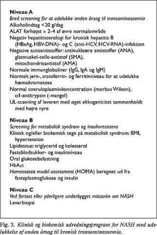 Dernæst udelukkes anden årsag til kronisk transaminasæmi svarende til niveau A. Herefter udredes patienten for risikomarkører for det metaboliske syndrom svarende til niveau B med blodsukker og lipidprofil. I den forbindelse kan man have glæde af at estimere insulinresistensen ud fra plasmaglukose og insulin ved homeostasis model assessment (HOMA) (26). Ved fortsat formodning om NASH i relation til det metaboliske syndrom anbefales til sidst niveau C med leverbiopsi for at stille den endelige diagnose. Denne udredningsstrategi er baseret på ønsket om at finde de patienter, der med størst sandsynlighed har NASH og udsætte så få som muligt for en leverbiopsi (27).