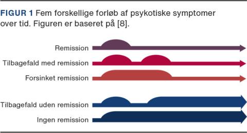 Sygdomsforløbet ved skizofreni varierer meget, og kun en mindre gruppe får et kronisk forløb med vedvarende behandlingskrævende symptomer. Nogle patienter opnår komplet remission efter første psykotiske episode, andre patienter oplever periodiske tilbagefald [6], men det anslås, at én ud af syv patienter bliver helt rask [7]. I det danske opsøgende behandling af unge med psykosesymptomer (OPUS)-studie har man undersøgt dette for en gruppe patienter og har som resultat identificeret fem overordnede forløb af psykotiske symptomer på lang sigt [8]. Hvert tilbagefald kan have alvorlige konsekvenser for patienten pga. risiko for tab af både job, uddannelse og sociale relationer, og det kan øge risikoen for selvmord [9]. I denne artikel vil vi undersøge, hvilke psykosociale interventioner der i tillæg til antipsykotisk behandling kan forebygge tilbagefald (Figur 1).