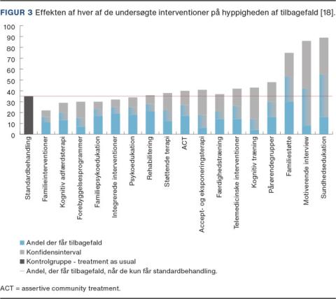 I analysen anslås det, at omkring hver tredje patient, der udelukkende fik antipsykotisk medicin, oplevede tilbagefald inden for 12 måneder, og ud fra dette blev det vurderet, hvilke supplerende psykosociale interventioner der bedst kunne forebygge tilbagefald. Hos de patienter, der havde modtaget familieinterventioner, var det kun ca. hver sjette, der oplevede tilbagefald. De, der fik kognitiv adfærdsterapi, klarede sig også godt, idet kun hver femte fik tilbagefald. Ved brug af familie-psykoedukation eller de integrerede interventioner reduceredes risikoen for tilbagefald også, idet kun ca. hver fjerde fik tilbagefald (hhv. 23% og 25%). Figur 3 viser effekten af hver af de undersøgte interventioner på hyppigheden af tilbagefald. Det fremgår af figuren, at en del af de psykosociale interventioner havde konfidensintervaller, der overlappede med effekten af standardbehandlingen, hvorfor man ikke kan fastslå, om de havde effekt [18].