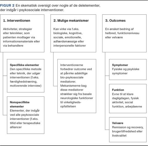De nonfarmakologiske interventioner kaldes også psykosociale interventioner. De kan defineres som interpersonelle eller informative behandlinger, der gennem en række forskellige mediatorer kan forbedre patienternes helbred, funktionsniveau eller velvære (Figur 2) [11].