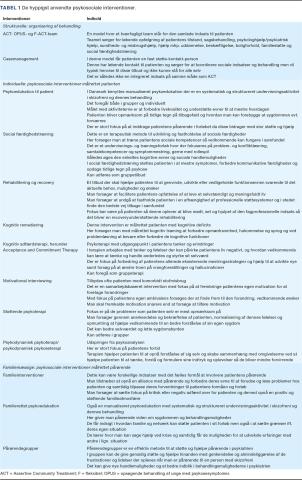 Der er evidens for god effekt af flere psykosociale interventioner, som er udviklet til behandlingen af skizofreni og andre psykoser (Tabel 1). Der er opnået gode resultater med at varetage koordineringen af patienternes behandlingstilbud og sociale aktiviteter inden for et assertive community treatment (ACT)-team. Teamet består af 5-15 fagpersoner, som er ansvarlige for behandling af hver 10-15 patienter. Det er teamets opgave at have løbende kontakt til patienterne og sørge for psykiatrisk behandling, social indsats, sundheds‐ og misbrugshjælp samt varetagelse af de psykosociale interventioner. De vigtigste elementer ved ACT-tilgangen er, at personalet indgår i et tværfagligt samarbejde, så man kan tilbyde den enkelte patient den relevante behandling. Teamet påtager sig også et større ansvar end vanligt i ambulant behandling for at opretholde kontakt, f.eks. gennem gentagne henvendelser, inddragelse af familien og tilbud om hjemmebesøg. I metaanalyser er det påvist, at ACT-tilgangen reducerer antallet af tilbagefald, fastholder patienter med skizofreni i behandlingsforløb, øger deres funktionsniveau, aflaster de pårørende og giver større brugertilfredshed [12, 13].
