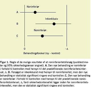 Alle påstande om effekt af nye behandlinger baseret på disse forsøg skal tolkes med varsomhed. Hvis materialet er stort, eller Δ er stor, eller hvis variationen i målingerne er mindre end forventet, kan der opstå den forvirrende situation, at den nye behandling er signifikant ringere end kontrollen, til trods for at resultatet enten er formelt inkonklusivt (dvs. den nedre sikkerhedsgrænse krydser linjen for noninferioritet) eller endda viser noninferioritet (dvs. sikkerhedsintervallet ligger inden for noninferioritetsintervallet) (Figur 1 ). I disse situationer kunne klinikerne lægge vægt på den signifikante forskel og undlade at bruge den nye behandling, idet Δ ofte er langt større, end hvad klinikere og myndigheder ville betragte som en minimal, relevant klinisk forskel [7].