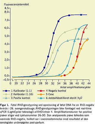I tredje graviditet blev kvinden derfor tilbudt amniocentese for at bestemme fosterets RHD -genotype. Det afslog kvinden imidlertid, og hun blev derfor kontrolleret i henhold til afdelingens instrukser for håndteringen af graviditeter med potentiel immunisering med ultralyd-Doppler-undersøgelse og måling af peak-systolisk blodhastighed i arterie cerebri media. Der blev derudover taget en blodprøve fra kvinden selv med henblik på noninvasiv bestemmelse af fosterets RHD -genotype ved opformering af føtal DNA fra maternelt plasma med PCR-teknologi (Figur 1 ). Analysemetoden var dog på dette tidspunkt ikke valideret i en sådan grad, at svaret kunne danne grundlag for en klinisk beslutning. Graviditeten udviklede sig normalt uden stigning i anti-D og uden tegn på anæmi hos fosteret vurderet ved de ovennævnte ultralydmålinger. Fødslen begyndte med spontan vandafgang i uge 37 + 3 og forløb uden komplikationer. En navlesnorsblodprøve viste normal hæmoglobin- og bilirubinkoncentrationer, og direkte Coombs test var negativ. Den serologiske RHD -fænotypning viste i overensstemmelse med den prænatale genetiske undersøgelse af føtalt DNA i moderens plasma, at barnet var RhD-negativt.