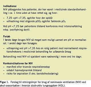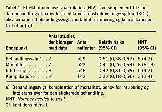 Cirka 200.000 danskere har kronisk obstruktiv lungesygdom (KOL), og akut eksacerbation i denne tilstand medfører årligt 23.000 indlæggelser. Standardbehandlingen af exacerbation i KOL er kontrolleret tilførsel af ilt, kortikosteroider, bronkodilatatorer og evt. antibiotika. Ved tillæg af noninvasiv ventilation (NIV) til standardbehandlingen hos KOL-patienter med akut respirations-insufficiens reduceres mortaliteten under indlæggelse fra 22% til 9%, svarende til en absolut risikoreduktion på 13%. Der skal derfor kun behandles otte patienter for at undgå et dødsfald ( number needed to treat (NNT) = 8 (6-13)). Risikoen for at der skal udføres intubation reduceres fra 33% til 14%, hvilket medfører, at der skal behandles fem for at undgå en intubation (NNT = 5 (4-7)). I en omkostningseffektivitetsanalyse er tillæg af NIV både bedre og billigere end standardbehandling alene. I Danmark kan man på årsbasis undgå ca. 230 dødsfald og 400 respiratorbehandlinger ved at benytte NIV tidligt i forløbet ved eksacerbation i KOL med akut respirationsinsufficiens.