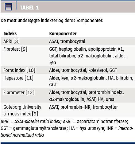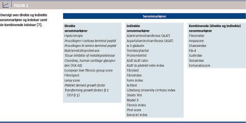 Serummarkørerne inddeles traditionelt i direkte og indirekte fibrosemarkører samt de kombinerede (direkte + indirekte). De direkte er et udtryk for omsætningen af den ekstracellulære matrix, og de indirekte afspejler leverens funktion [7]. I Figur 1 ses en oversigt over serummarkørerne. I Tabel 1 angives de mest undersøgte indekser og deres komponenter, og i Tabel 2 angives AUROC-værdierne for hyaluronsyre (HA) og indekserne.