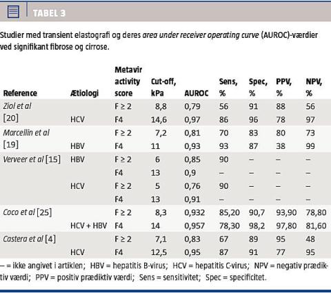 I TE-studier har man påvist, at LSM korrelerer godt med histologien, og TE anses for at være pålidelig til at detektere F ≥ 2 og F4 hos patienter med HCV og kronisk HBV-infektion [19, 20] (Tabel 3). I en metaanalyse med 50 studier fandt man AUROC-værdier på 0,84 for F ≥ 2 og 0,94 for F4 i en population, hvor årsagerne til leverfibrose var forskellige. I metaanalysen konkluderede man, at TE var udmærket til bestemmelse af F4, men at man skulle være varsom med at benytte TE, når der skulle skelnes mellem F1 og F2 [26]. I et nyere studie med patienter med HBV- og HCV-infektion påviste man, at TE var optimal til vurdering af F ≥ 3, men suboptimal til vurdering af F ≤ 2 [15].