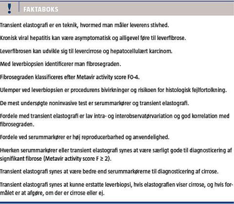 TE og serummarkører er overordnet lige ringe til diagnosticering af F ≥ 2, når de benyttes solitært. En kombination af de noninvasive undersøgelser (TE med FT) giver formentlig et marginalt bedre resultat, end når en noninvasiv undersøgelse benyttes alene. Ved F4 har TE vist så gode resultater, at leverbiopsi oftest helt kan undlades. Ved cirrose optimeres diagnostikken ikke ved at tilføje serummarkører til TE [29].