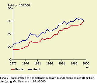 Forekomsten af nonmelanomhudkræft (NMSC), der typisk omfatter basalcellekarcinom (BCC) og spinocellulært karcinom (SCC) i huden stiger voldsomt på verdensplan. De årlige rapporter fra Cancerregistret viser samme tendens, selv om stigningen i Danmark er mere moderat (Figur 1 ).