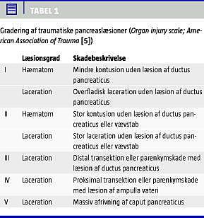 Pancreaslæsioner ses hos 3-12% af børn, som har været udsat for et stumpt abdominalt traume [1-4]. Læsioner af pancreas inddeles i fem kategorier (Tabel 1 ). Lette former for pancreaslæsioner (grad I og II) behandles nonoperativt hos både børn og voksne [1, 3]. Alvorlige pancreaslæsioner (grad III-V) hos voksne patienter behandles generelt operativt, mens valget af operativ versus nonoperativ behandling af disse læsioner hos børn er kontroversielt [1-3]. Vi beskriver et barn med en grad III-pancreaslæsion, som blev behandlet nonoperativt.