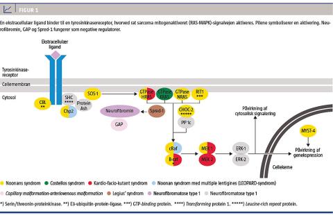 (Figur 1). De fleste sygdomsfremkaldende mutationer øger aktiviteten i signalvejen [18]. Mutationer i PTPN11 kan påvises hos lidt mere end 40% [13]. Oftest er det missense-mutationer, der reducerer funktionen af proteinet SHP2, hvorved RAS-MAPK-signalvejen opreguleres [18]. Desuden er der i ca. 11% [13] af tilfældene beskrevet mutationer i SOS1, også oftest missense, der ligeledes for det meste opregulerer RAS-MAPK-signalvejen [18]. Hertil kommer mutationer i RAF1 (4,7%), KRAS (1,4%), BRAF (0,8%), NRAS (0,2%) [13], MAP2K1