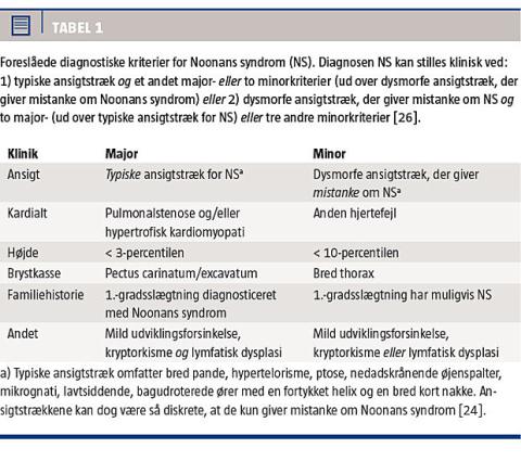 De diagnostiske kriterier, som blev fremsat af van der Burgt et al i 1994 [28], er modificeret og implementeret i de retningslinjer for håndtering af patienter med NS, som Noonan Syndrome Guideline Development Groupunder Dyscerne (et europæisk netværk af centre med ekspertise i dysmorfologi) publicerede i 2010 (Tabel 1) [30]. Noonan Syndrome Support Group har også udgivet retningslinjer for diagnosticeringen og behandlingen af patienter med NS i 2010 [13]. Sidstnævnte indeholder ikke diagnostiske kriterier, men anbefaler kendskab til de almindelige kliniske karakteristika ved NS og brug af molekylærgenetisk testning.
