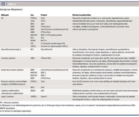 viden om de molekylærgenetiske årsager står det nu klart, at denne kliniske differentiering i nogle tilfælde kan være vanskelig, og at der findes et betydeligt klinisk overlap (Tabel 3). NS kan desuden ligne adskillige andre syndromer, herunder Turners syndrom og føtalt alkoholsyndrom [13].