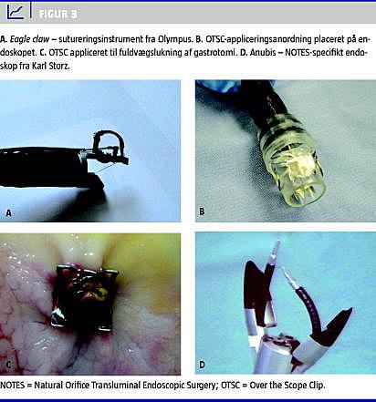 Der er udviklet flere produkter til endoskopisk fuldvægslukning af gastrotomien: Over the Scope Clip (OTSC) (OVESCO), Tissue Anchor (TAS, Ethicon Endosurgery), EndoCinch , (Davol-Bard), Eagle Claw (Apollo Group, Olympus) (Figur 3A ), Stringer Device (LSI solutions) og G-Prox (USGI Medical). Af de nævnte produkter udviser især OTSC - en cirkulær metalklips, som kan påsættes gastrotomien via endoskopet - et stort potentiale i randomiserede studier [3] (Figur 3B og 3C).