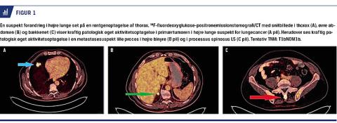 afgøre, om der er tale om en malign eller en benign sygdom [1], på trods af at inflammatoriske/granulomatøse/infektiøse infiltrater også optager FDG. På den samme diagnostiske FDG-PET/CT kan sygdommen stadieinddeles. FDG-PET/CT er påvist at have en betydeligt højere sensitivitet og specificitet end CT alene til afgørelse af, om der er spredning til mediastinale lymfeknuder, hhv.79-85% og 87-92% versus 57-68% og 76-82%. Spredning til mediastinale lymfeknuder er en væsentlig faktor for, om kirurgisk behandling er mulig. Med FDG-PET/CT kan man ligeledes bedre påvise tegn på fjernmetastasering end med CT. Op til 10% af patienterne har vist sig at have synlig fjernmetastasering på FDG-PET/CT, hvilket ikke kunne ses på CT alene, og TNM-klassifikationen ændres i op til 62% af tilfældene ved at stadieinddele med PET/CT versus CT [2, 3] (Figur 1).