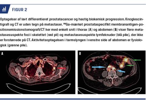 I dag er 68Ga-PSMA den mest udbredte PET-tracer og anvendes internationalt og nationalt rutinemæssigt til stadieinddeling af højrisikoprostatacancer og ved recidivmistanke hos patienter med stigende koncentration af den cirkulerende biomarkør prostataspecifikt antigen efter radikal prostatektomi [4] (Figur 2).