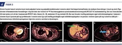 I et prospektivt studie fra 2012 med 254 patienter, der havde tumorer større end 2 cm, kunne man efter FDG-PET/CT ændre det kliniske stadie i 77 tilfælde (30,3%) med fund af uventet N3-sygdom hos 40 patienter og fjernmetastaser hos 53 patienter og størst effekt hos patienter med klinisk stadie 2B-sygdom. Dette resultat er bekræftet i andre studier [14] (Figur 3). Dette er i stigende grad ved at vinde klinisk indpas i internationale guidelines, og efterhånden anvendes PET/CT også på danske hospitaler. Fjernmetastaser ses hos op til 20% af patienterne. Knoglescintigrafi er en udbredt undersøgelse, der er velegnet til at screene for knoglemetastaser pga. lave omkostninger og høj tilgængelighed samt en sensitivitet på 62-100% og en specificitet på 78-100%. Knoglescintigrafi har en højere sensitivitet end CT og røntgenoptagelse, men lavere specificitet, idet aktivitetsoptagelsen på en knoglescintigrafi reflekterer knoglevævets normale reaktion på en forandring uanset genese og derfor også vil være positiv ved f.eks. en benign fraktur. Knoglemetastaser vil typisk være synlige på knoglescintigrafien i flere måneder, før de kan ses på et røntgenbillede. NaF-PET/CT har en sensitivitet på 98% og en specificitet på 93% versus CT med hhv. 77% og 93% til påvisning af knoglemetastaser fra brystcancer, dette begrundes overvejende med den bedre billedopløsning i PET i forhold til gammakameraundersøgelser.