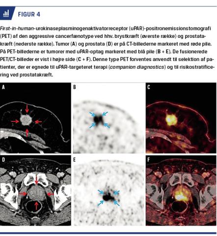 Begrebet companion diagnostics dækker over analyser, herunder billeddannende metoder, der benyttes til afgørelse af, om en behandling er relevant at tilbyde. Som et eksempel på denne anvendelse, har vi for nylig udviklet en PET-tracer, hvormed man kan påvise urokinaseplasminogenaktivatorreceptoren (uPAR) [16, 17] (Figur 4). uPAR er et terapeutisk mål, da uPAR-positive celler er årsag til den metastatiske proces. Til dato har kliniske afprøvninger af uPAR-targeteret terapi dog vidtgående været uden succes, da man ikke har haft mulighed for