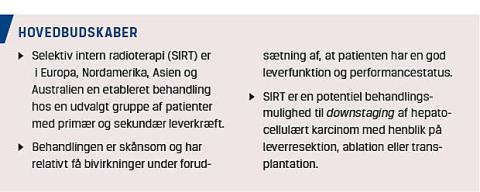 Vi har beskrevet SIRT-behandlingen, som den er implementeret på Aarhus Universitetshospital. I den forbindelse er der indført en ny nuklearmedicinsk billeddiagnostik og invasive radiologiske procedurer til planlægning af behandlingen, og der anvendes særlige modeller til beregning af behandlingsdosis ved SIRT. På længere sigt forventes billedbaseret tredimensional dosisberegning [21, 22] at blive taget i klinisk anvendelse, således at dosis til den raske lever kan vurderes ud fra eksempelvis dosis-volumen-histogrammer (som anvendt ved ekstern stråleterapi), frem for at basere planlægningen på en middeldosis.