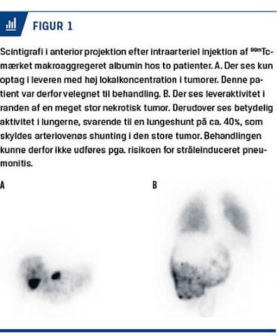 Som det første sted i Danmark har man på Aarhus Universitetshospital indført selektiv intern radioterapi (SIRT) til udvalgte patienter med hepatocellulært karcinom (HCC). I Danmark er incidensen af HCC ca. 300 tilfælde pr. år og svagt stigende [1, 2]. HCC opstår hyppigst hos patienter med cirrose, men i Danmark ses lidelsen også ofte i noncirrotisk lever. Potentielt kurativ behandling opnås ved resektion, radiofrekvensablation eller transplantation. Kemoembolisering anvendes palliativt ved større tumorer, men denne behandling er relativt kontraindiceret ved samtidig vena portae-trombose. Patienter med portatrombose vil i særlige tilfælde kunne tilbydes en ny type lokalbehandling, nemlig SIRT. Der foreligger endnu ingen randomiserede studier eller placebokontrollerede studier, men fase 1- og fase 2-studier og talrige retrospektive studier [3]. SIRT blev indført i Danmark i 2013 til behandling af patienter med nonresektabel HCC og samtidig vena portae-trombose men uden ekstrahepatisk sygdom. Der forudsættes god leverfunktion (bilirubinkoncentration < 35 mikromol/l, ingen ascites) og god almentilstand (The Eastern Cooperative Oncology Group/World Health Organization Performance Status: 0-2). SIRT kan også anvendes hos udvalgte patienter med neuroendokrine tumorer med levermetastaser [4, 5]. De væsentligste kontraindikationer er tidligere ekstern strålebehandling af leveren, stor tumorbyrde (> 50%) og risiko for en væsentlig andel af behandlingsstof i raske organer som lunger, ventrikel og duodenum. Behandlingen foregår i et tæt samarbejde mellem forskellige specialer: hepatologer, interventionsradiologer samt nuklearmedicinske speciallæger og hospitalsfysikere.