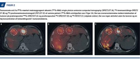 Modsat andre anvendte isotoper udsender 90Y ikke gammastråling. Der er alligevel mulighed for billeddannelse med gammakamera (eller SPECT) på baggrund af såkaldt bremsestråling. De resulterende billeder er mere uskarpe end ved gammaemitterende isotoper, men af tilstrækkelig kvalitet til at man kan vurdere, om der er behandlingsstof uden for leveren (Figur 2B). Yderligere er der mulighed for at foretage positronemissionstomografi (PET) på baggrund af en meget lille andel udsendte positroner [10]. I leveren, hvor koncentrationen af 90Y er højest, kan man opnå billeder, som har god rumlig opløsning og er kvantitativt korrekte [11, 12] til vurdering af partikelfordelingen og potentielt beregning af den faktisk afsatte stråledosis [13] (Figur 2C).