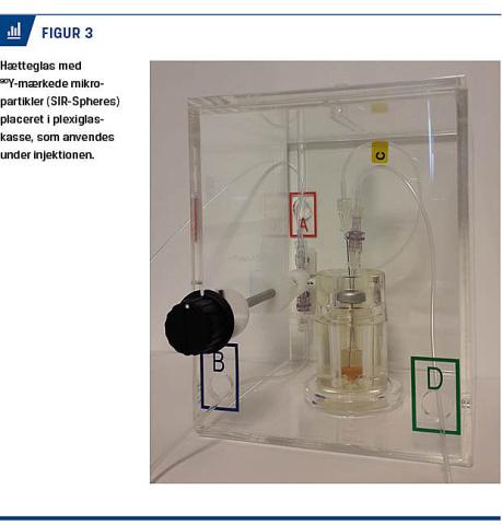 De 90Y-mærkede mikropartikler (SIR-Spheres) produceres i Singapore kort tid før behandlingen og flyves til Danmark. På behandlingsdagen, 1-2 uger efter udredningen, overføres den beregnede behandlingsdosis til et hætteglas i en speciel plexiglaskasse, der yder strålebeskyttelse mod ß--stråling (Figur 3).