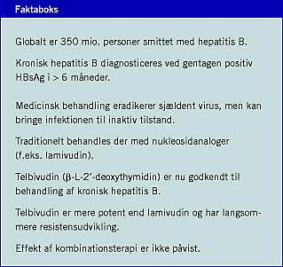 Summary New treatment of chronic hepatitis B Ugeskr Læger 2008;170(48):3937-3939 Worldwide, 350 million people are infected with chronic hepatitis B. Over the last few years, it has been possible to treat chronic hepatitis B. Treatment very often consists of nucleos(t)ide analogs and in a few cases of pegylated α -interferon. In 2007, a new nucleoside analog, Telbivudine, was approved to treat chronic hepatitis B. In phase II and ongoing phase III studies, Telbivudine has proven more effective than the nucleoside analog, Lamivudine, which was very often used up until recently.