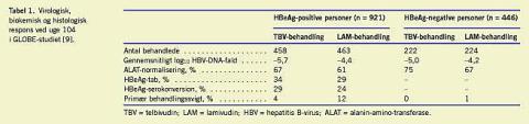 GLOBE-studiet er et fase III-studium med 1.367 nukleosidnaive, overvejende asiatiske patienter, der havde kompenseret kronisk hepatitis B og blev randomiseret til LAM 100 mg dagligt eller TBV 600 mg dagligt i 104 uger. Patienterne var stratificerede for HBeAg-status; 921 patienter var HBeAg-positive og 446 HBeAg-negative. Efter 104 ugers behandling var TBV superior til LAM med bedre primært effektmål (terapeutisk respons, HBV-DNA < 5 log10 kopier/ml, tab af HBeAg og normalisering af ALAT) og for alle direkte mål af antiviral effekt for både HBeAg-positive og HBeAg-negative patienter (Tabel 1 ). Behandlingssvigt sås signifikant hyppigere for LAM end for TBV i begge grupper (HBeAg-positive og HBeAg-negative) [9].