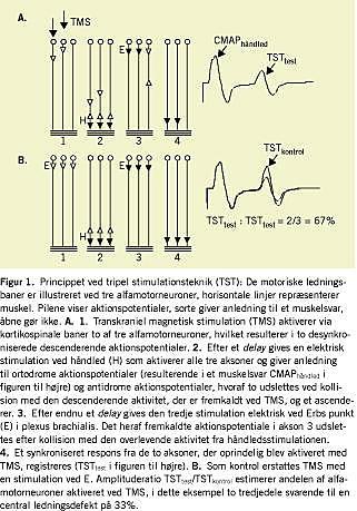 Ved transkraniel magnetisk stimulation (TMS) fremkaldes kontraktion af muskler i arme og ben ved magnetisk stimulation af motoriske cortex og nerverødder. Centrale og perifere ledningstider til musklerne måles, hvorved man kan lokalisere læsioner til det centrale eller perifere nervesystem. Måling af kortikospinale baners funktion kan imidlertid være vanskelig. Man har derfor videreudviklet metoden med tripel stimulationsteknik (TST) (Figur 1 ), som kombinerer TMS med perifere nervestimulationer, hvilket muliggør kvantitativ estimering af ikkeledende kortikospinale fibre [1, 2].