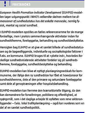 Baggrunden er forståelsen af, at den rolle, som livsstilssygdomme og kroniske sygdomme spiller i det moderne samfund, gør det nødvendigt, at sundhedsvæsenet fokuserer mere på sundhedsfremme og på, hvorledes sundhedsfremme kan spille sammen med det øvrige sundhedsvæsen. Formålet med EUHPID har været at udforme et system af indikatorer, med hvilket der sættes større fokus på netop sundhedsfremme. Samtidig skal EUHPID også tjene som planlægningsværktøj, der kan skabe større sammenhæng mellem forskellige sundhedsfremmetiltag og andre sundhedspolitiske tiltag [2]. I denne artikel gennemgås EUHPID-modellen og desuden diskuteres dens relevans i dansk sammenhæng.