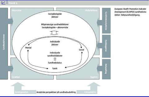 EUHPID-modellen (Figur 1 ) tager udgangspunkt i WHO's velkendte skelnen mellem tre dimensioner af sundhedsstatus hos det enkelte menneske , nemlig fysisk, mental og social sundhed. Disse dimensioner er naturligvis også forbundne, jf. i øvrigt pilene på Figur 1 [3].