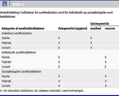 EUHPID modellen opstiller altså en fælles referenceramme for de mange forskellige men i praksis -sammenhængende aktiviteter inden for sundhedsfremme, forebyggelse, behandling og sundheds-beskyttelse. Modellens hovedinddeling i indikatorer for sundhedsstatus samt for individuelle og socioøkologiske sundhedsfaktorer kan yderligere opdeles, hvis det er hensigtsmæssigt i forhold til vurdering af de pågældende aktiviteter (Tabel 1 ). Dels kan man inden for hver af de tre kategorier differentiere i henhold til de tre WHO-dimensioner; det fysiske, det psykiske og det sociale. Hertil kan føjes yderligere underopdelinger i forhold til, hvilket af de to perspektiver, det patogenetiske og det salutogenetiske, der bærer den pågældende aktivitet.