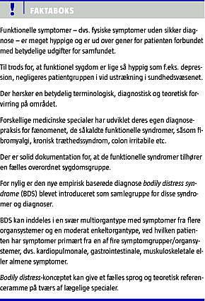 Formålet med denne artikel er at gennemgå terminologien og begreberne i relation til funktionelle symptomer og at præsentere et nyt diagnosekoncept - bodily distress syndrome - for at fremme udviklingen af et fælles sprog og en teoretisk referenceramme på tværs af lægelige specialer.