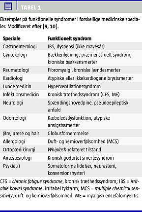 Den manglende accept af den somatoforme diagnosekategori har medført, at forskellige medicinske specialer har udviklet deres egne diagnoser, de såkaldte funktionelle syndromer (Tabel 1 ) [7, 9, 10]. Fælles for disse er, at diagnoserne i klinisk praksis er eksklusionsdiagnoser, dvs. at de er baseret på subjektive klager og såkaldte provokerede kliniske fund, men ikke på objektive kliniske eller parakliniske fund. Idet mange af patienterne har multiple symptomer, og eftersom syndromdiagnoserne er udviklet i højt selekterede patientpopulationer inden for hver deres speciale, er diagnosekriterierne overlappende [9, 12] med høj »komorbiditet« syndromerne imellem [7, 13, 14].