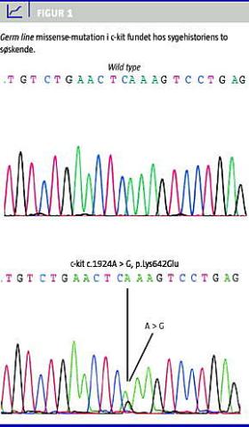 De to søskende havde en germ line missense -mutation i c-kit: c.1924 A > G, p.Lys642Glu (Figur 1 ). Mutationen er lokaliseret i det første tyrosinkinasedomæne og inducerer konstitutiv fosforylering af c-kit. Denne mutation er tidligere beskrevet hos tre familier med GIST [4, 5]. Der er i familien foretaget præsymptomatisk testning, og hos mutationspositive, asymptomatiske personer er der iværksat et kontrolprogram med kapselendoskopi og gastroskopi hvert andet år, og ved relevante symptomer vil der blive udført positronemissionstomografi/computertomografi.