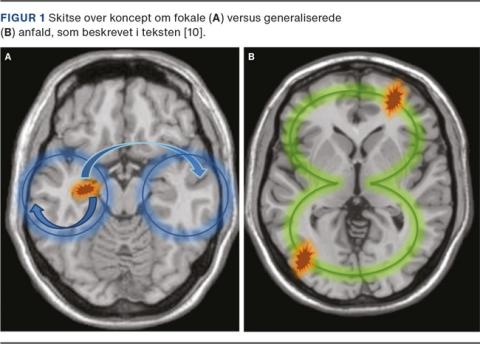Centralt i klassifikation af de epileptiske anfald er idéen om »det epileptiske fokus« (Figur 1). Idéen er allerede fremsat af Gowers [8]. En læsion eller funktionsforstyrrelse medfører ændringer, der fører til abnorm excessiv eller synkron neuronal aktivitet i et afgrænset område, hvorved der opstår et anfald. Indholdet af anfaldet (semiologien) svarer til områdets normale funktion og kan derfor variere meget fra motoriske symptomer til ændret sansning eller kognitive symptomer.