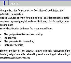 Sygdommen akut pankreatitis (AP) forløber hos ca. 85% af patienterne ukompliceret. I de resterende tilfælde udvikles varierende grader af organpåvirkning, nekrose af pankreas og ruptur af ductus pancreaticus med ledsagende intra- og peripankreatiske ansamlinger. Svær AP er forbundet med betydelig morbiditet og mortalitet [1, 2]. En entydig terminologi med klare definitioner er vigtig for at kunne beskrive sygdommens karakter og sværhedsgrad, så passende intervention kan iværksættes rettidigt, og resultatet heraf kan vurderes ensartet på tværs af behandlingscentre.