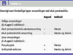 I Atlantaklassifikationen beskrev man fire typer ansamlinger: den akutte væskeansamling, pseudocysten, pankreasnekrosen og pankreasabscessen. En gennemgang af litteraturen efter 1992 viser, at disse begreber ikke har været dækkende for beskrivelsen af kompliceret AP [5]. Således har f.eks. begrebet pankreasabsces været anvendt til at beskrive såvel inficerede pseudocyster uden nekrotisk debris som purulente ansamlinger med nekroser. Da prognosen ved og behandlingen af disse tilstande er vidt forskellig, er en mere entydig nomenklatur påkrævet.